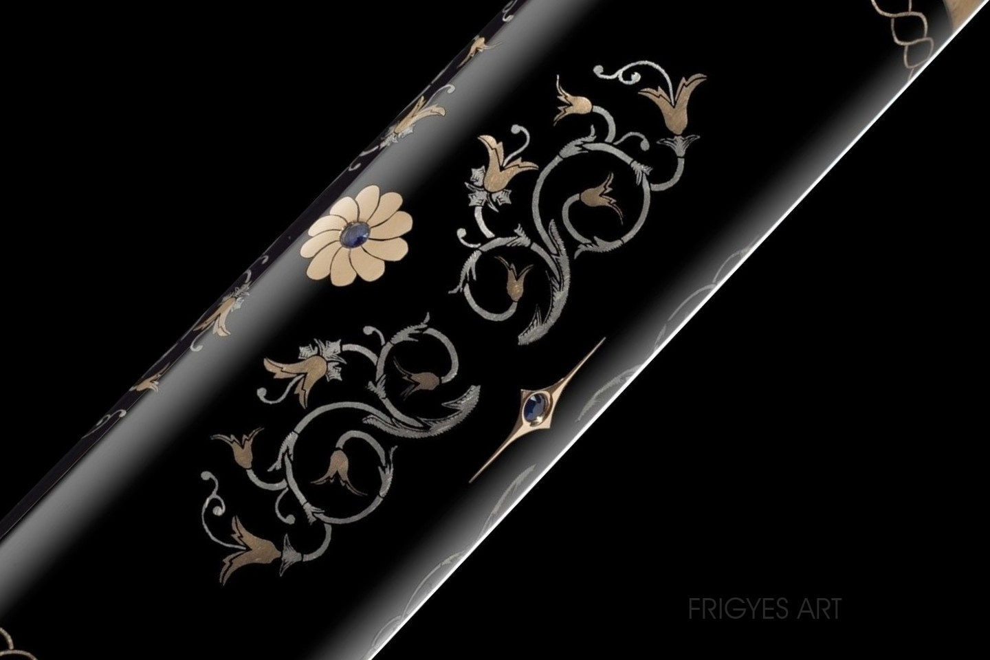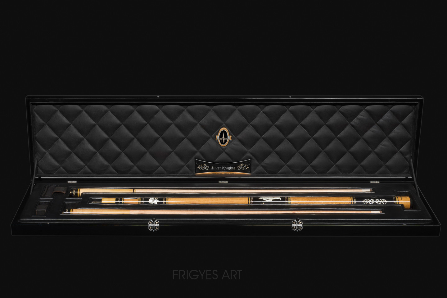 Its ornament is made of fine gold and silver plates, the thoroughly elaborated and hand-carved 1128 inlays and the 20 sapphire marquetries give the custom cue a remarkable sight.