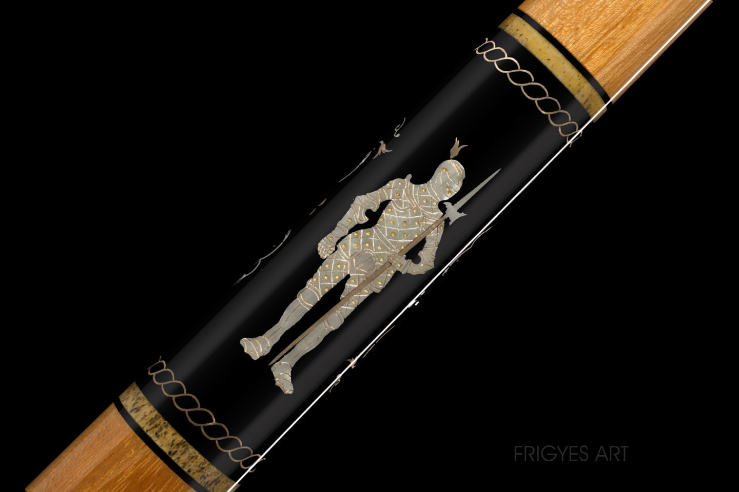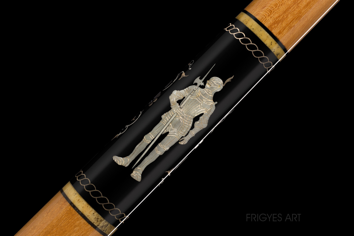 The custom cue, which revives the spirit of the age of knights, has been made with the inlay of gold, silver and some sapphire patterns, and with the use of pieces of antlers and leather.