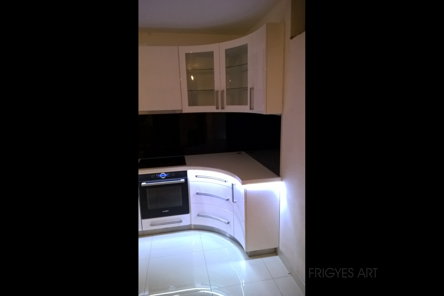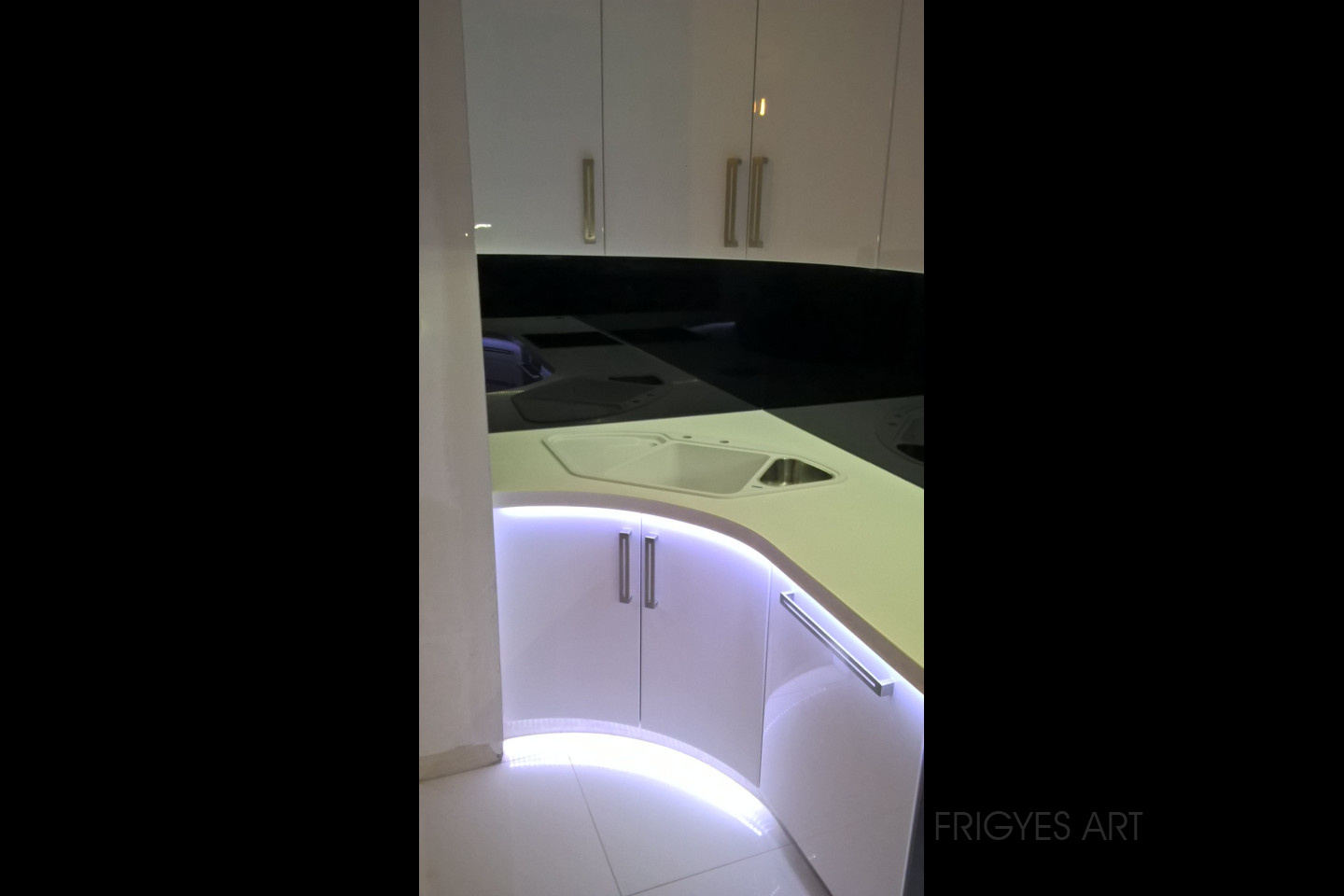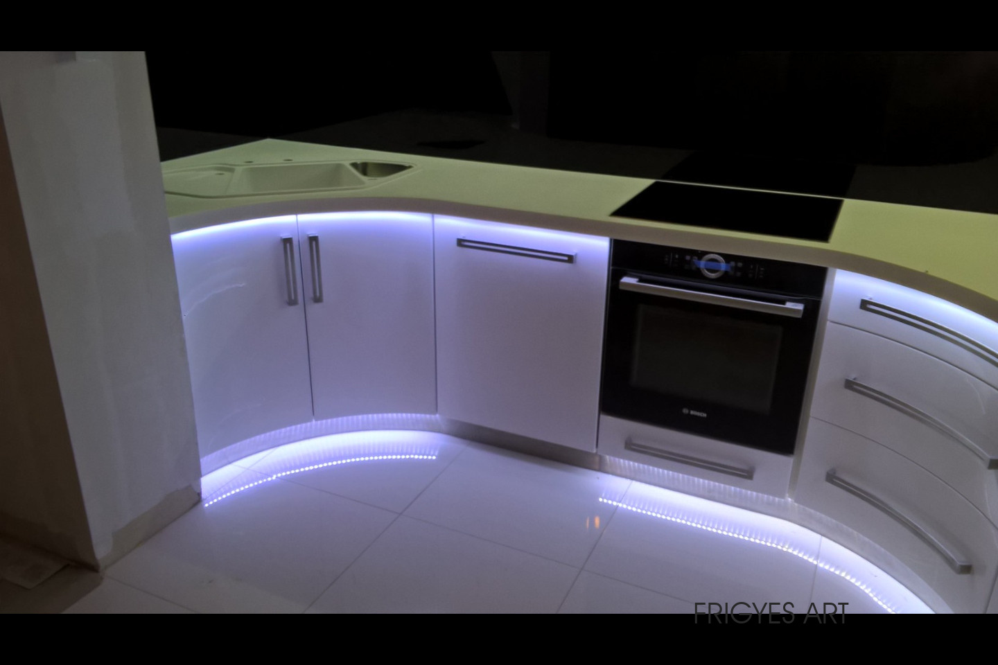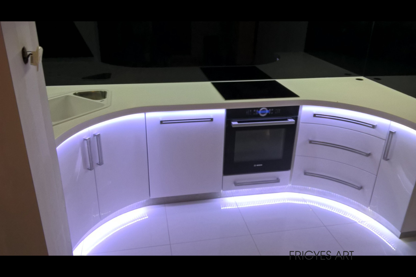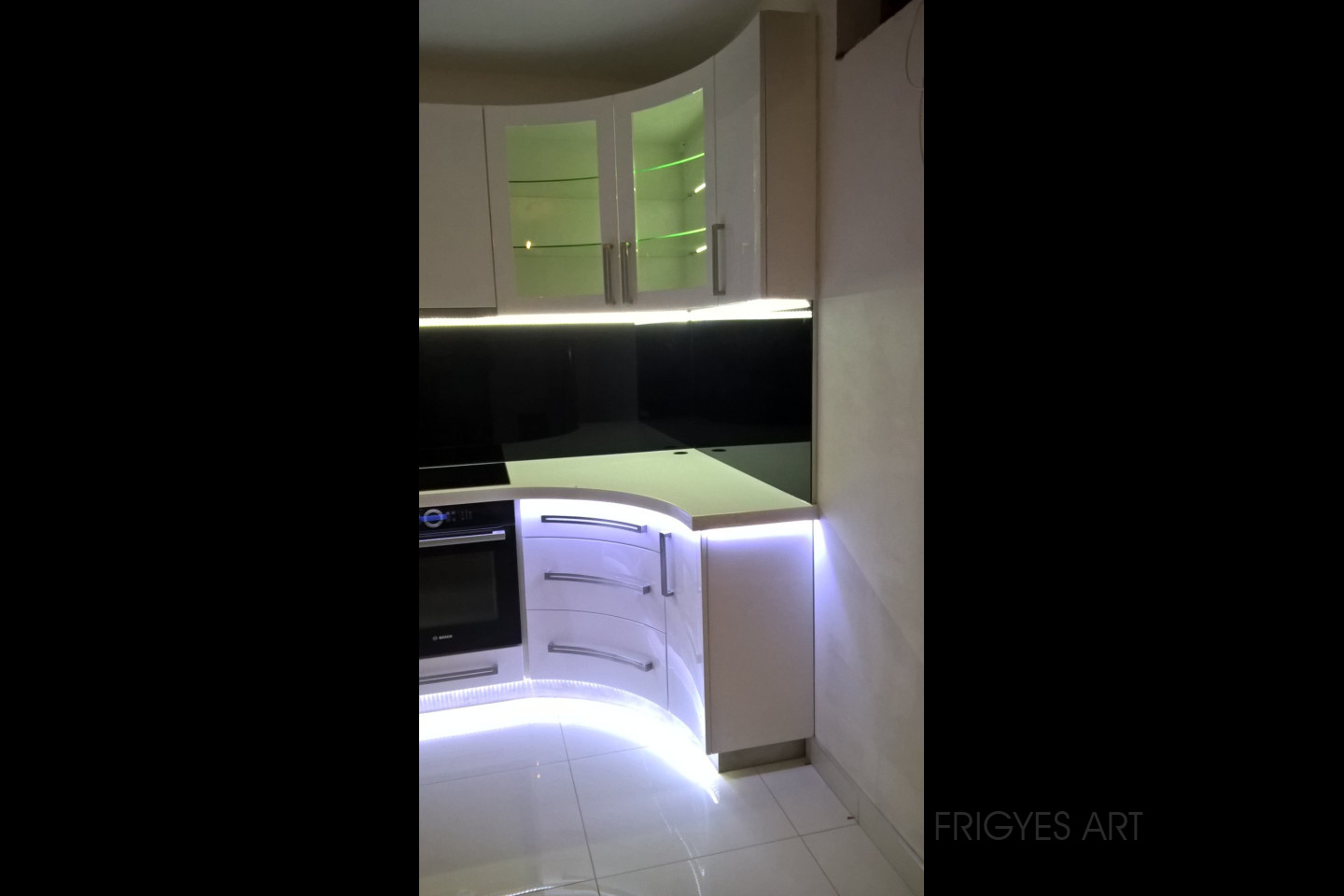 Egyedi megrendelés alapján gyártott fehér Magasfényű polírozott MDF konyhabútor corian munkalappal ellátva. Az ajtók MDF anyagból speciális hajlítással egyedi méretre gyártással készültek. Felső sarokban elhelyezett szekrény üveges ajtajai üveghajlító sablonban erre a igény szerinti ajtókra hajlítva készültek. Rozsdamentes fogantyúk kifejezetten erre az egyedi bútorra lettek megalkotva és meghajlítva. Az össze korpusz belső led világítással rendelkezik melyet ajtónkénti nyitás érzékelős infrakapú vezérli. A munka pult és a lábazat alatt elhelyezett led világítást érintő képernyős vezérlő egységgel lehet szabályozni.