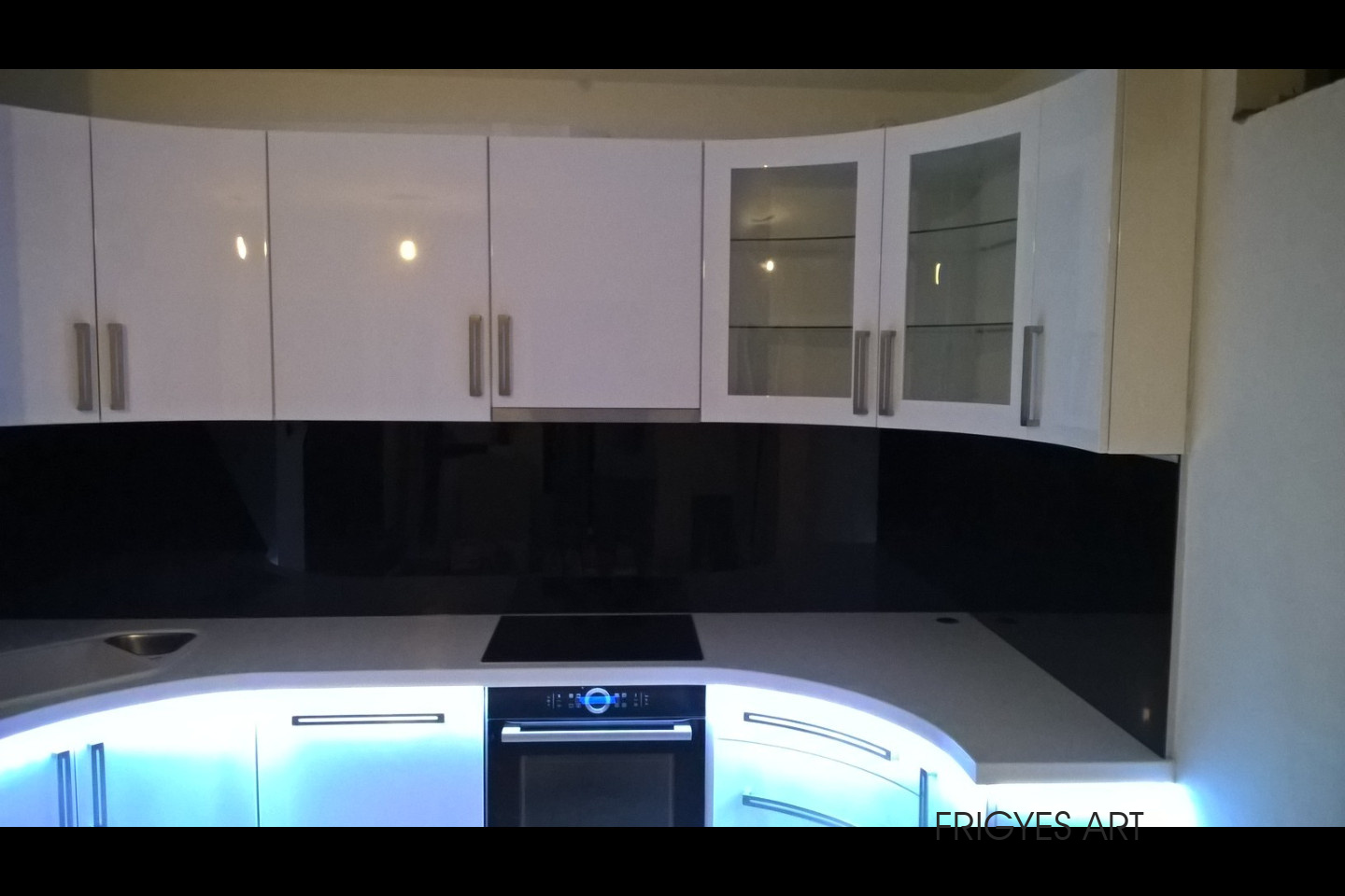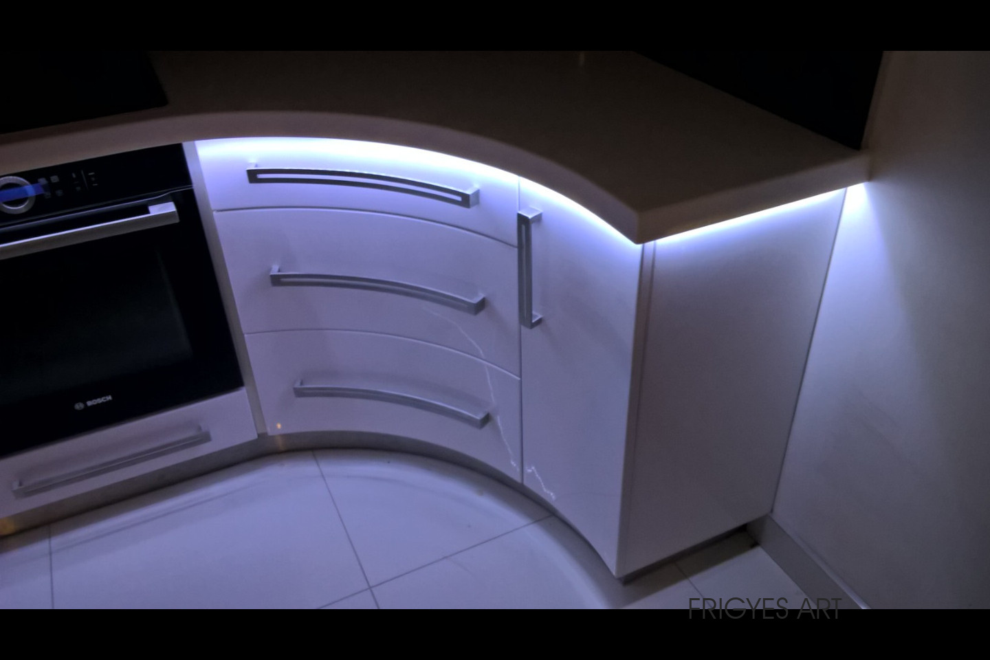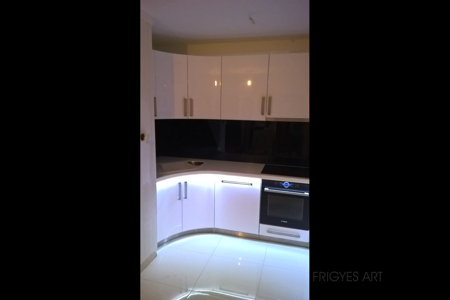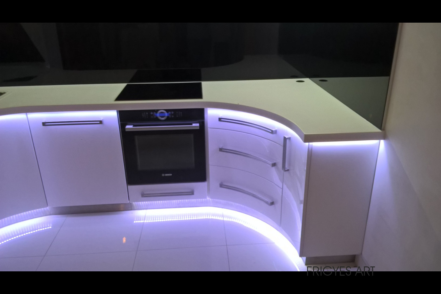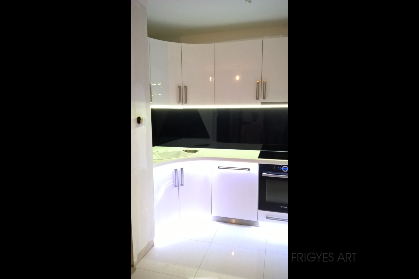 Egyedi megrendelés alapján gyártott fehér Magasfényű polírozott MDF konyhabútor corian munkalappal ellátva. Az ajtók MDF anyagból speciális hajlítással egyedi méretre gyártással készültek. Felső sarokban elhelyezett szekrény üveges ajtajai üveghajlító sablonban erre a igény szerinti ajtókra hajlítva készültek. Rozsdamentes fogantyúk kifejezetten erre az egyedi bútorra lettek megalkotva és meghajlítva. Az össze korpusz belső led világítással rendelkezik melyet ajtónkénti nyitás érzékelős infrakapú vezérli. A munka pult és a lábazat alatt elhelyezett led világítást érintő képernyős vezérlő egységgel lehet szabályozni.