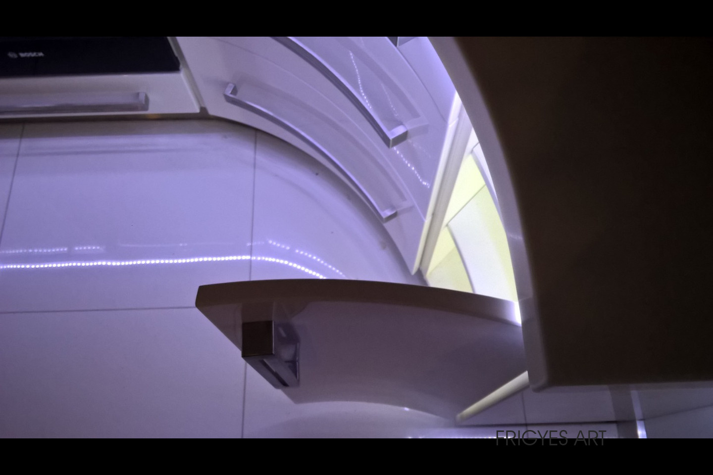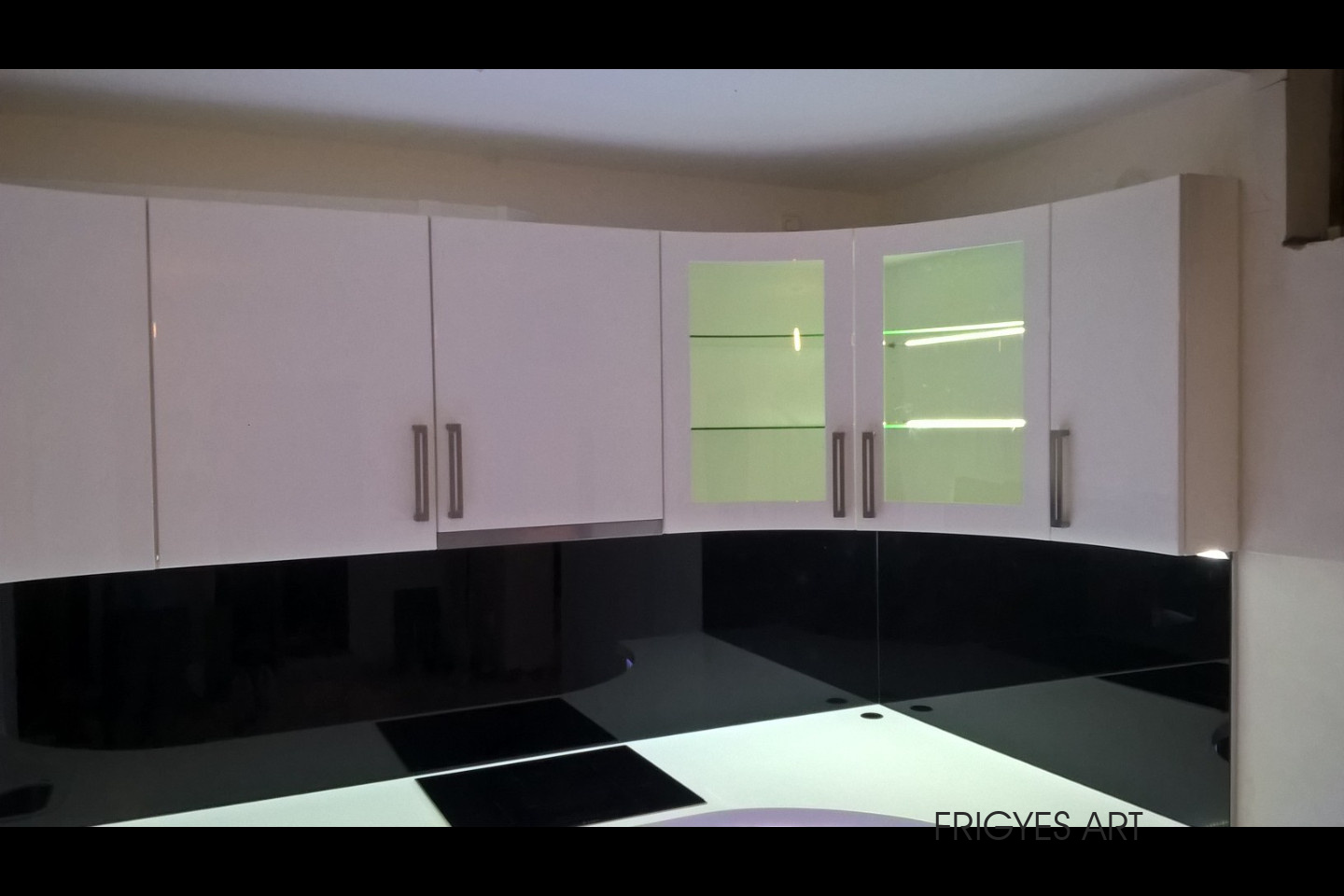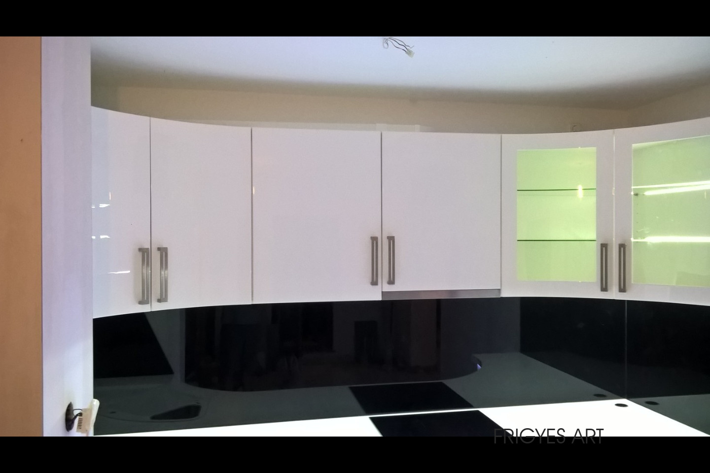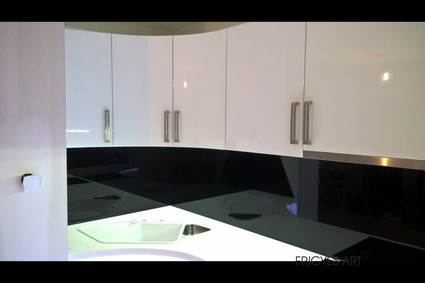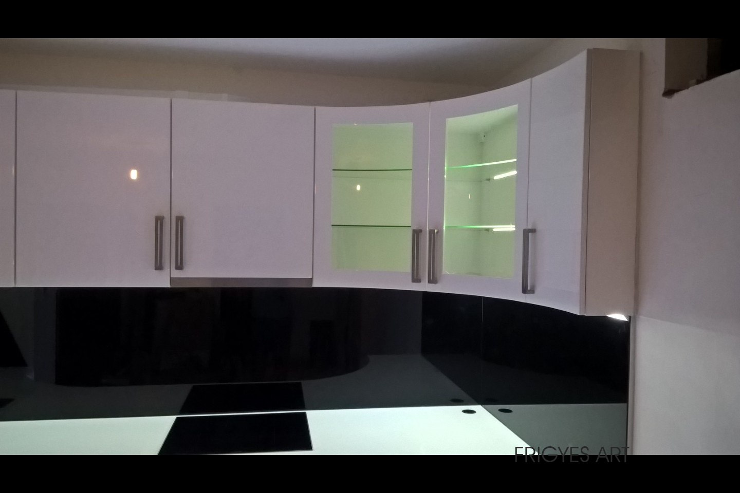 Egyedi megrendelés alapján gyártott fehér Magasfényű polírozott MDF konyhabútor corian munkalappal ellátva. Az ajtók MDF anyagból speciális hajlítással egyedi méretre gyártással készültek. Felső sarokban elhelyezett szekrény üveges ajtajai üveghajlító sablonban erre a igény szerinti ajtókra hajlítva készültek. Rozsdamentes fogantyúk kifejezetten erre az egyedi bútorra lettek megalkotva és meghajlítva. Az össze korpusz belső led világítással rendelkezik melyet ajtónkénti nyitás érzékelős infrakapú vezérli. A munka pult és a lábazat alatt elhelyezett led világítást érintő képernyős vezérlő egységgel lehet szabályozni.