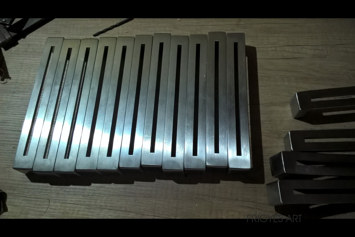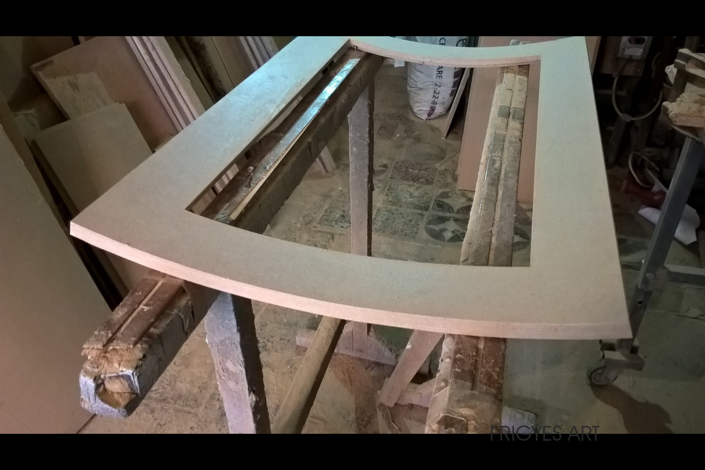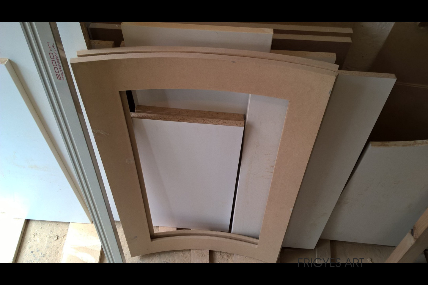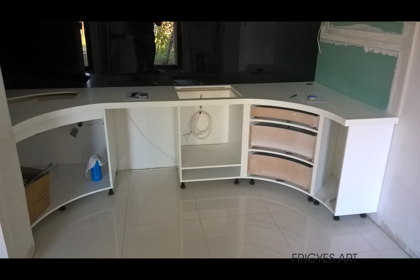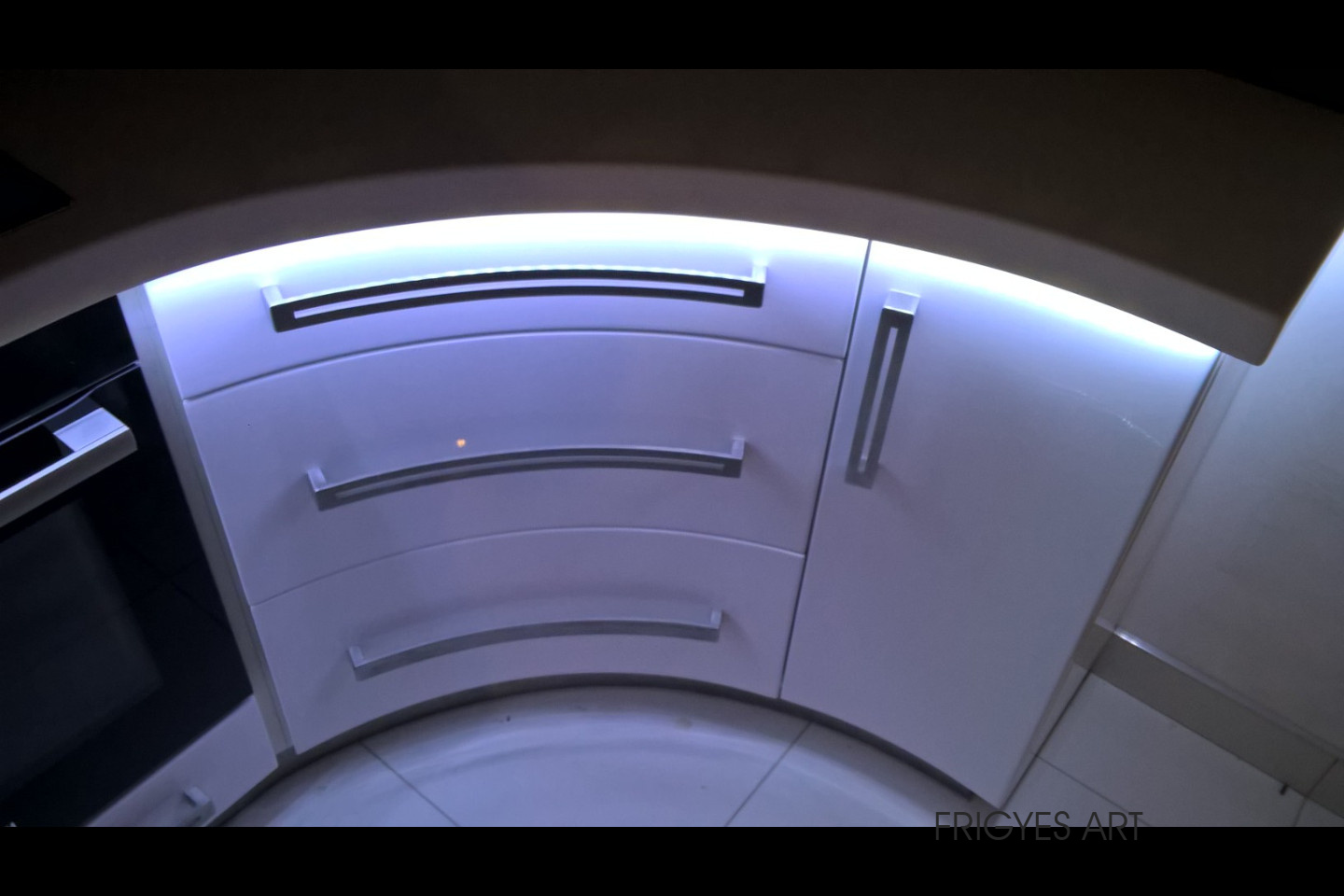 Egyedi megrendelés alapján gyártott fehér Magasfényű polírozott MDF konyhabútor corian munkalappal ellátva. Az ajtók MDF anyagból speciális hajlítással egyedi méretre gyártással készültek. Felső sarokban elhelyezett szekrény üveges ajtajai üveghajlító sablonban erre a igény szerinti ajtókra hajlítva készültek. Rozsdamentes fogantyúk kifejezetten erre az egyedi bútorra lettek megalkotva és meghajlítva. Az össze korpusz belső led világítással rendelkezik melyet ajtónkénti nyitás érzékelős infrakapú vezérli. A munka pult és a lábazat alatt elhelyezett led világítást érintő képernyős vezérlő egységgel lehet szabályozni.